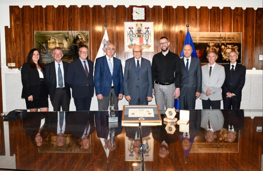 L-R: Elaine Lenzo, Peter Paul Tabone, Benoit Waelkens, Alexander Demarco, Governor Edward Scicluna, Szymon Kurowski, Oliver Bonello, Joseph Esposito, Kevin Cassar